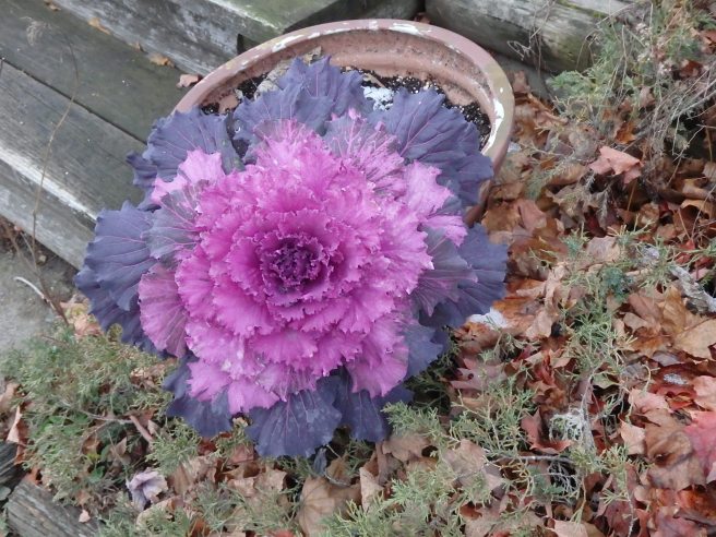 A pot of decorative red cabbage sits beside our front steps this time of year.