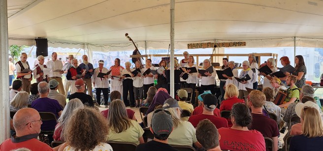 The Maine Balkan Choir international music and dance ensemble performs at the annual Common Ground Fair during hour-long breaks in the big contradance tent. The choir rehearses in three subgroups across the state and then comes together for events like this.