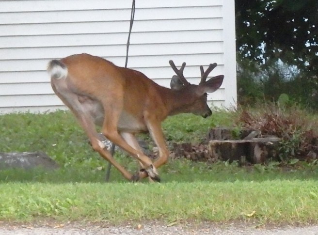 This buck, taking off from our yard, is sprinting across the lawn across the street.